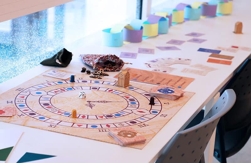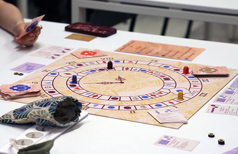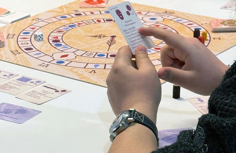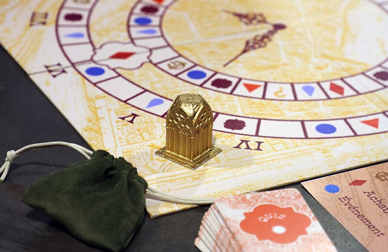 Erwan : En effet, le but est aussi que les joueuses et joueurs apprennent des informations sur les œuvres. Les cases du plateau donnent place au hasard avec des événements comme « incendie », mais aussi à la stratégie avec les cases « challenge » où les joueurs peuvent se défier entre eux et tester leurs connaissances.