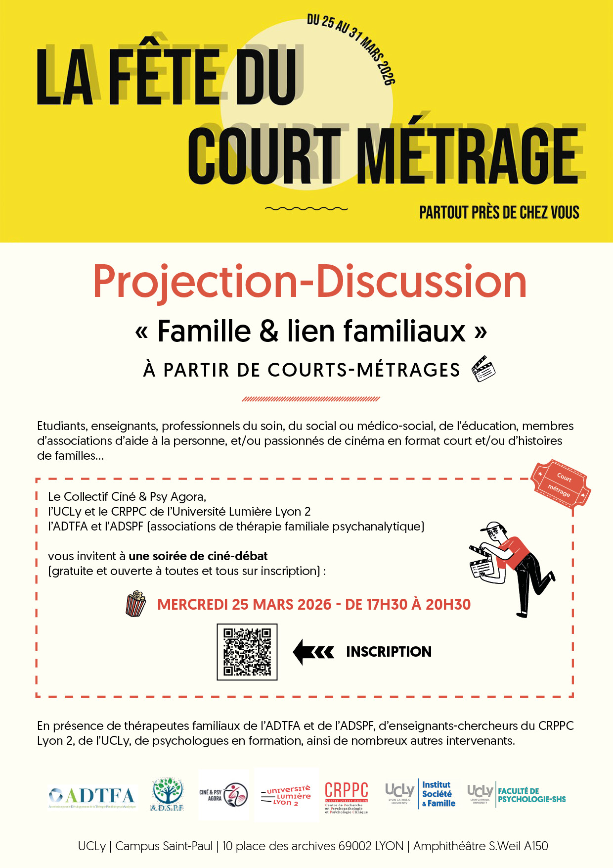 Cette année, à cette occasion, le Collectif Ciné & Psy Agora, l'UCLy (l'Institut Société et Famille et la Faculté de Psychologie), le CRPPC de l’Université Lumière Lyon 2, l’ADTFA et l’ADSPF (associations de thérapie familiale psychanalytique) vous invitent à une soirée de ciné-débat ; une projection-discussion « Famille et liens familiaux » à partir de courts-métrages.