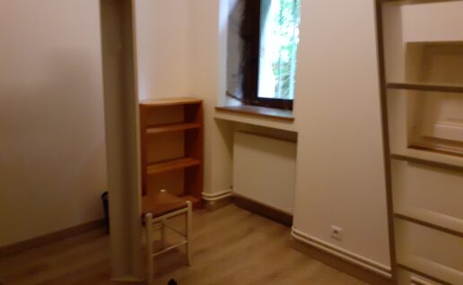 Equipements de la chambre : lit double (140 x 190), belle cheminée, parquet, lustre design, grand bureau et chaise de bureau, corbeille à linge, très grand placard avec penderie et 3 grandes étagères.