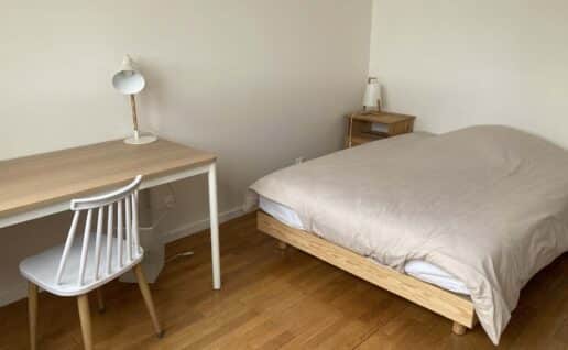 Equipements de la chambre : lit double (140 x 190), belle cheminée, parquet, lustre design, grand bureau et chaise de bureau, corbeille à linge, très grand placard avec penderie et 3 grandes étagères.