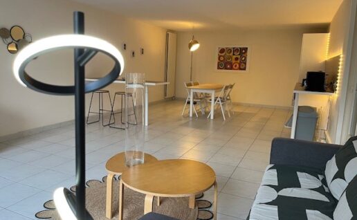 Parties communes : Salle de bain avec baignoire et douche, WC, cuisine équipée, salon et salle à manger.