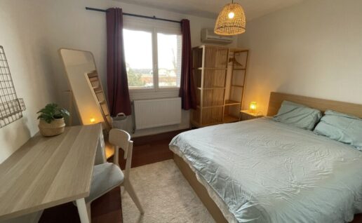 Située à l'étage, équipée d'un lit simple, un grand placard, un bureau et une chaise (draps et serviettes fournies).