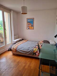 Belle chambre lumineuse de 18 m² avec balcon, équipée d'un lit double, armoire de rangement, bureau, chaise et accès internet.