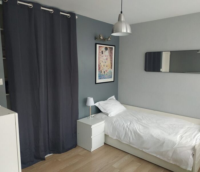 Chambre 1 : chambre de 10m2 équipée d'un lit simple (90cm), bureau, penderie et placard.