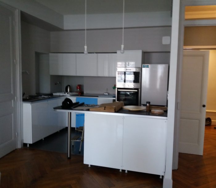 Parties communes : Grande salle de séjour et salon, coin cuisine entièrement équipée, salle de bain avec baignoire, WC, dressing.