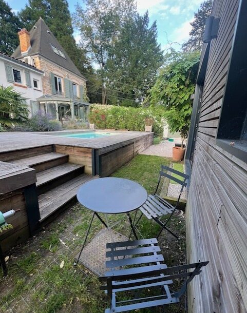 Celui-ci donne directement sur le jardin et la piscine. Petit coin aménagé juste devant avec une petite table et 2 chaises.