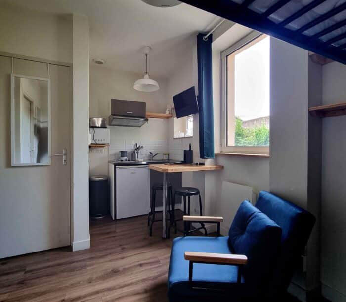 Studio lumineux meublé de 13 m² avec lit-mezzanine simple, coin cuisine équipée et salle de bains, situé dans une petite résidence indépendante, dans un quartier calme.