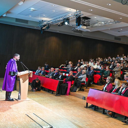 Dès le début de son discours, le Recteur a rappelé combien la tradition universitaire, loin d’être un frein, fonde l’avenir et la continuité du projet de l’UCLy.