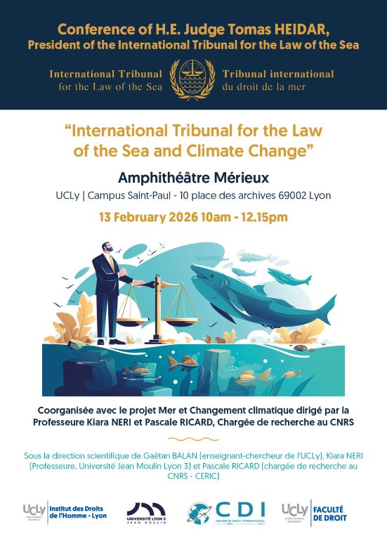 La Faculté de Droit de l’UCLy, l’Institut des Droits de l’Homme de Lyon et le Programme de recherche universitaire Mer et Changement climatique ont l’honneur de recevoir le Président du Tribunal International du Droit de la Mer, son excellence le Juge Tomas HEIDAR pour une conférence à destination des étudiants sur le Tribunal et le changement Climatique.