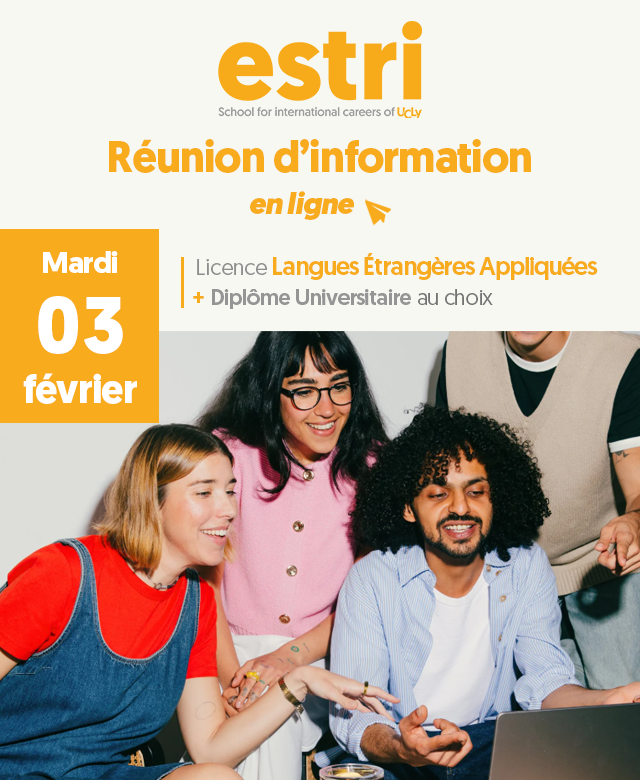 Rejoignez notre réunion d'information en ligne mardi 03 février à 18h, animée par Dominique Vinay, Directrice de l'ESTRI, et avec la participation d'étudiants de l'ESTRI.