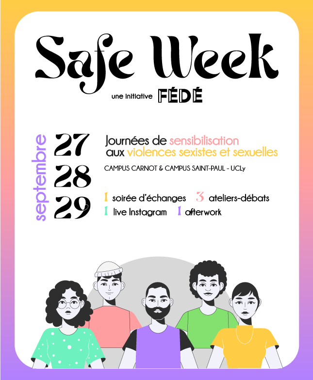 Le 27 septembre prochain s'ouvrira la première édition de la Safe Week : trois journées de sensibilisation mêlant échanges et ateliers-débats autour des violences sexistes et sexuelles et du consentement en milieu festif animés par plusieurs associations lyonnaises et parisiennes :