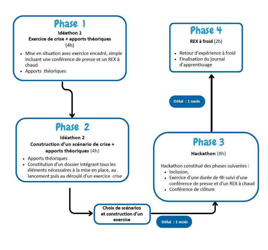 - Phase 1 et 2 : Idéathon 1 et Idéathon 2. Ils permettent aux étudiants d’appréhender des situations de crise par des apports théoriques et des expériences pratiques
