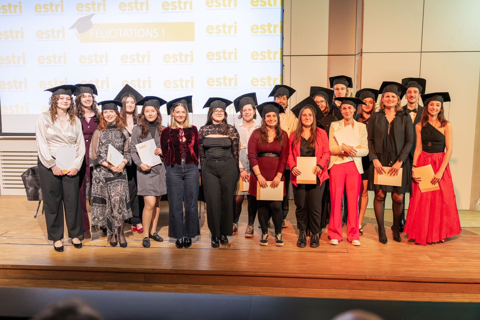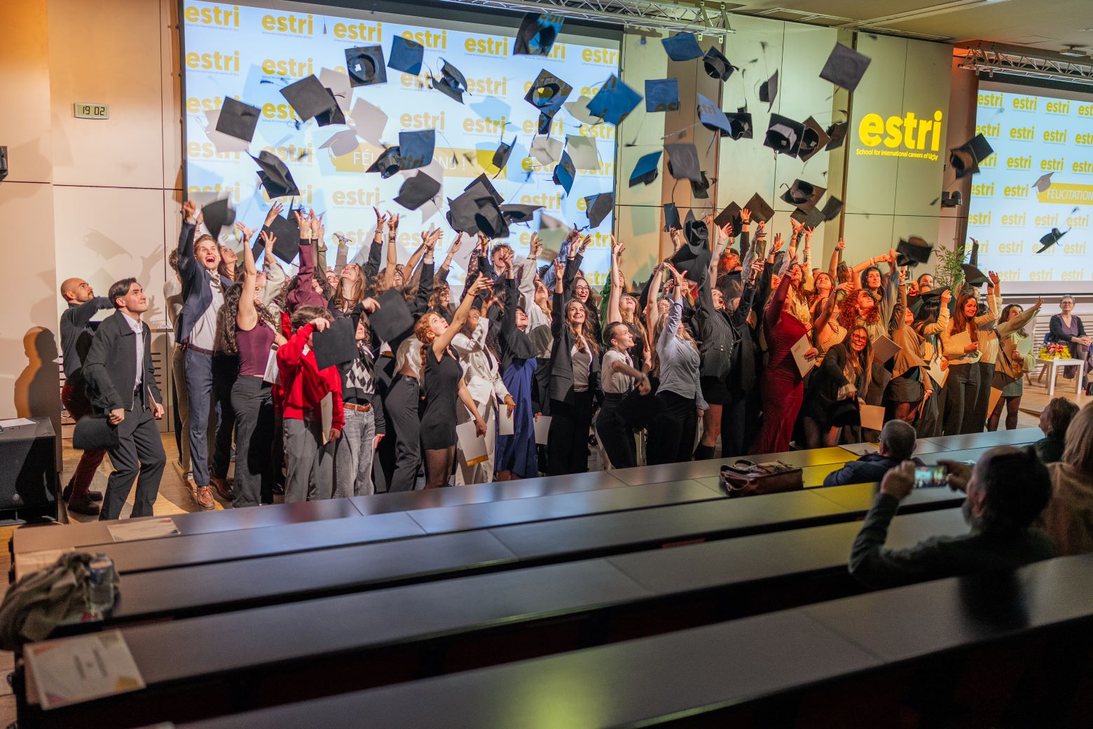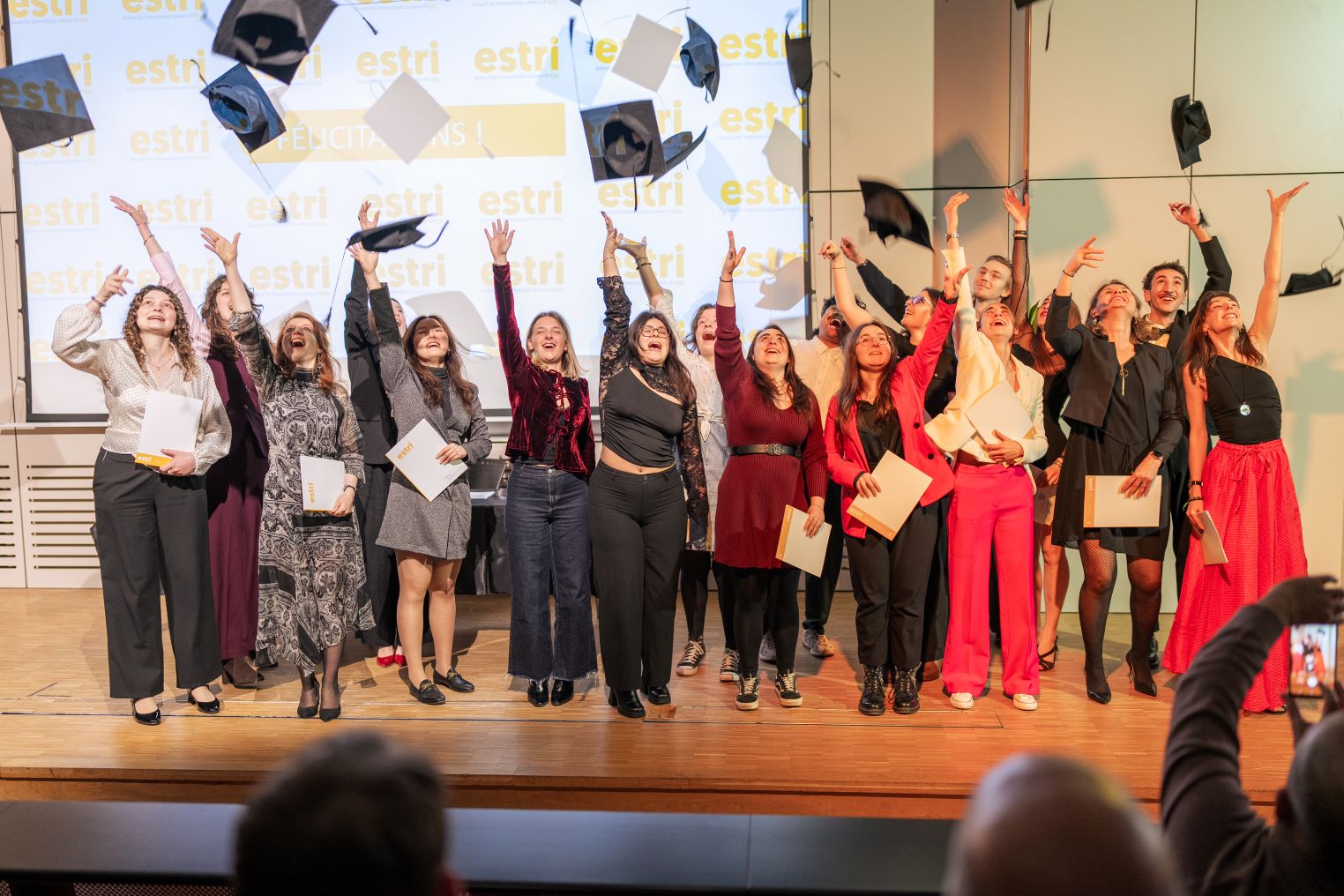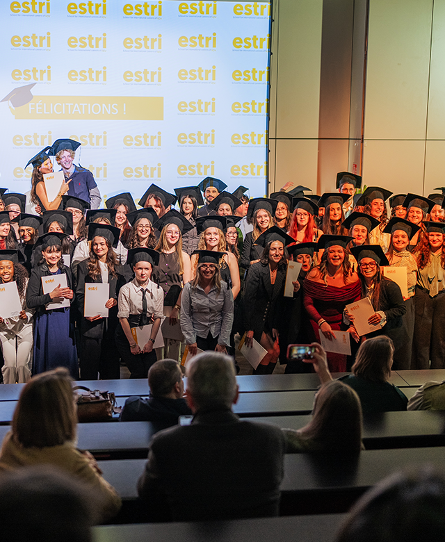 Tour à tour, devant leurs proches, les anciens étudiants ont reçu leurs diplômes avant de célébrer collectivement cet accomplissement par le traditionnel lancer de chapeaux, marquant la fin de leur parcours à l'ESTRI. Relations internationales, Traduction, Communication internationale et multilingue, Management interculturel... : chaque étudiant a pu trouver sa voie grâce aux différentes expériences vécues pendant ses études.