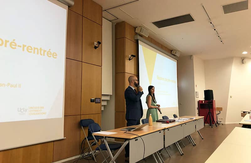 Vendredi 8 septembre, ce sont tous les L1, L2 et L3 de Lettres modernes qui se sont retrouvés dans l’Amphithéâtre Jean-Paul II, sur le Campus Carnot, à 10h. La réunion a commencé par un bel accueil du Professeur Olivier Artus, Recteur de l’UCLy. Elle s’est poursuivie avec la présentation de la vie étudiante, de la mission culture ou encore du tutorat (assuré par une ancienne étudiante).